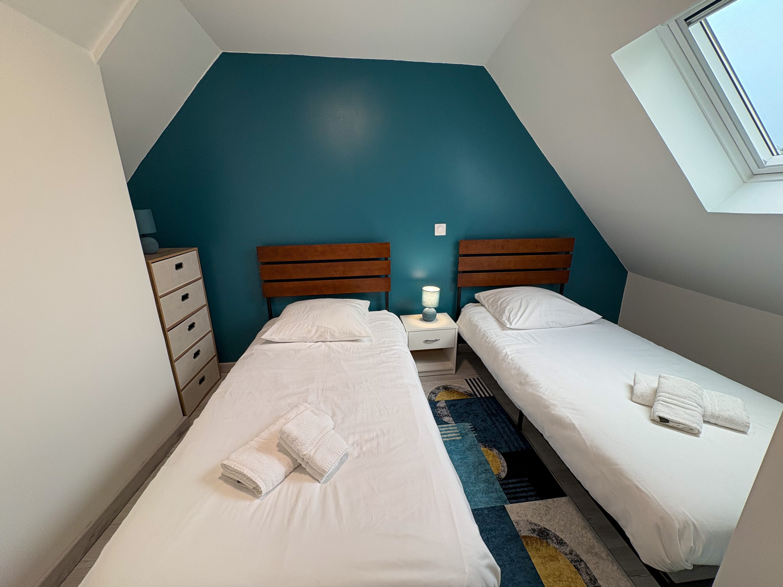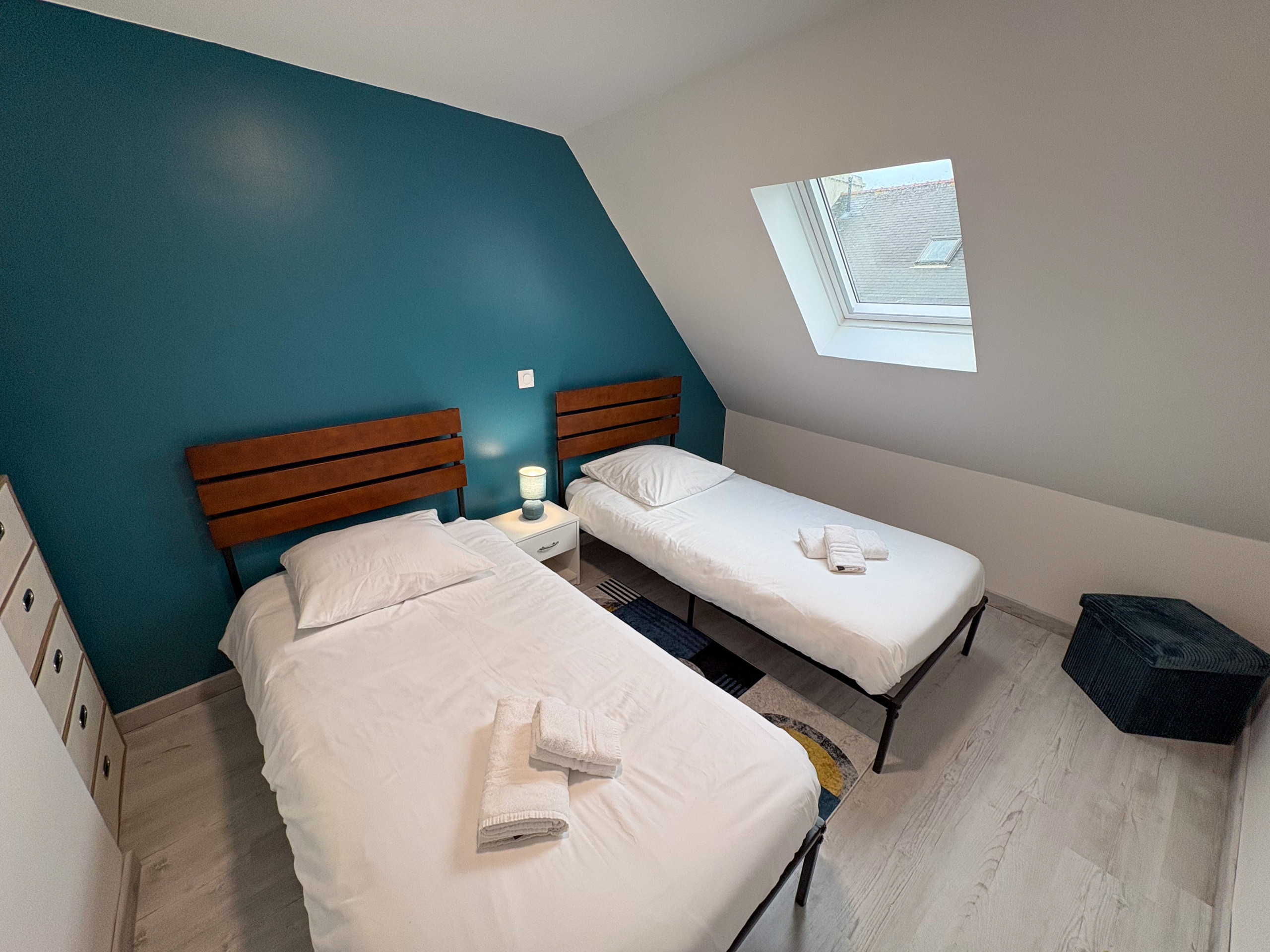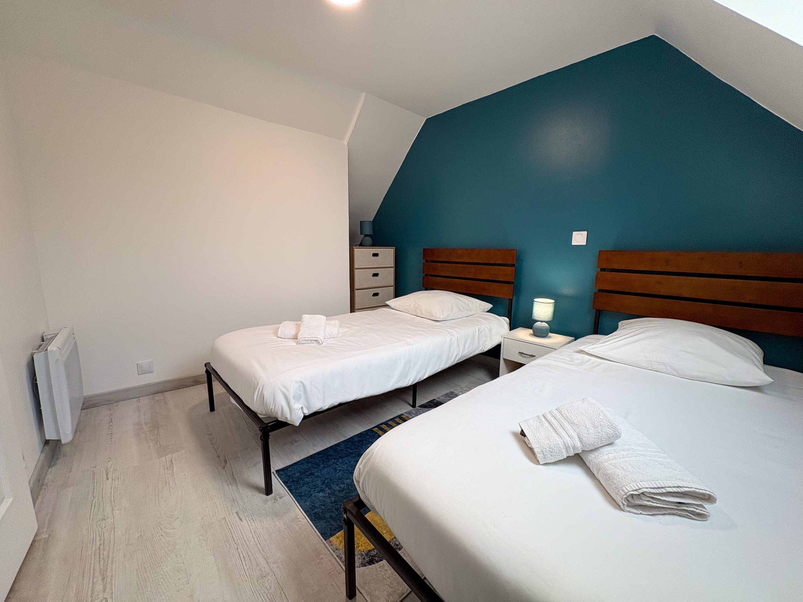 Une seconde chambre lumineuse aux accents bleus équipée de deux lits simples (90x190cm).