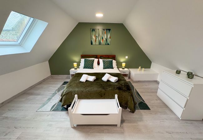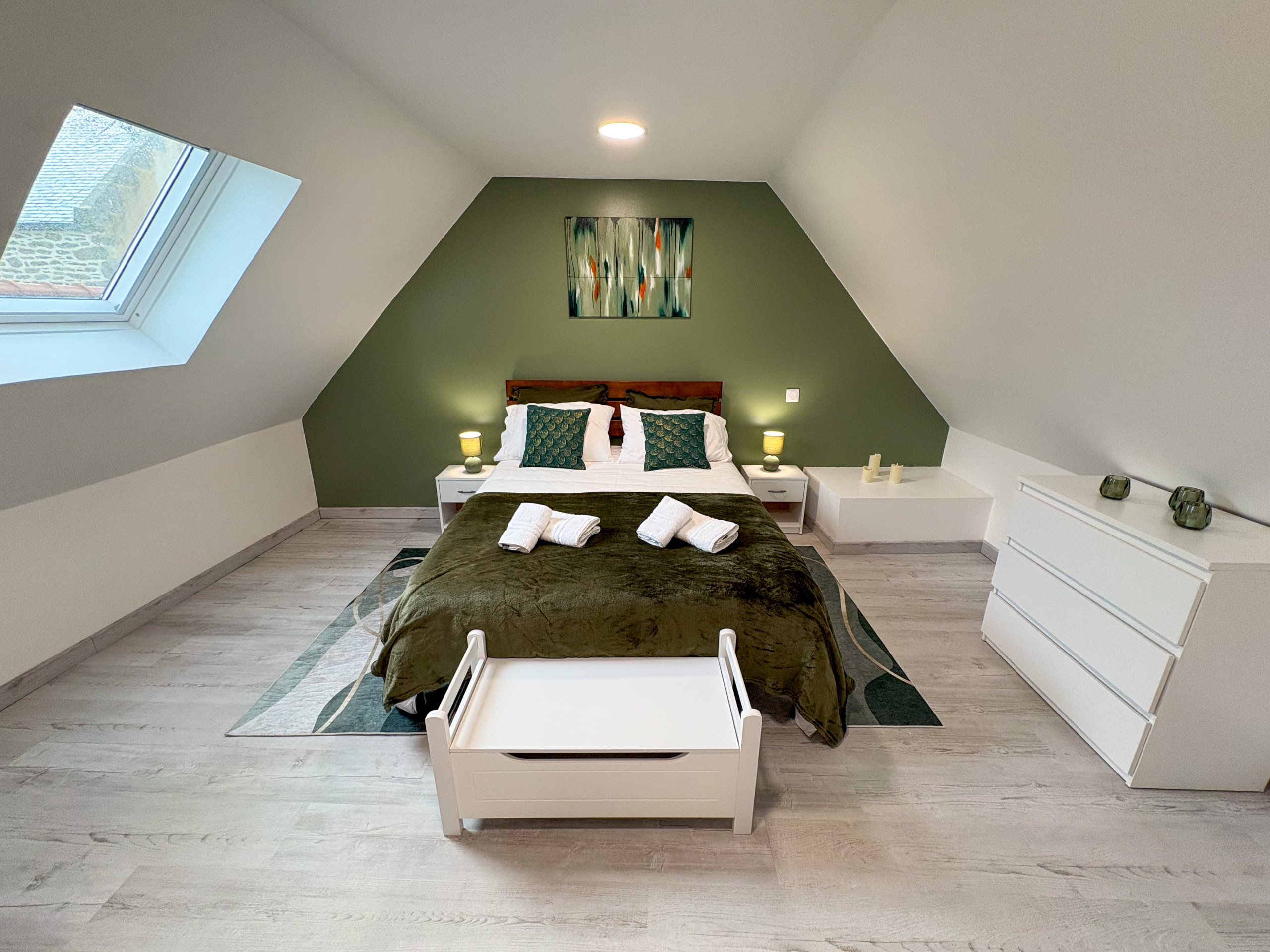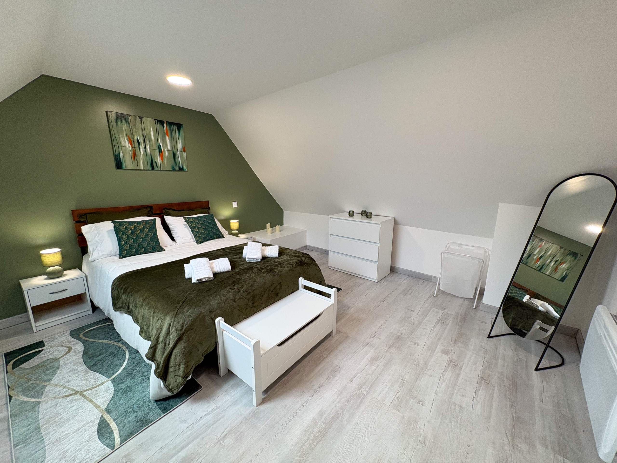 A l'étage vous trouverez l'espace nuit avec une première chambre parentale élégante et spacieuse aux tons vert forêt avec un grand lit double (140x190cm).