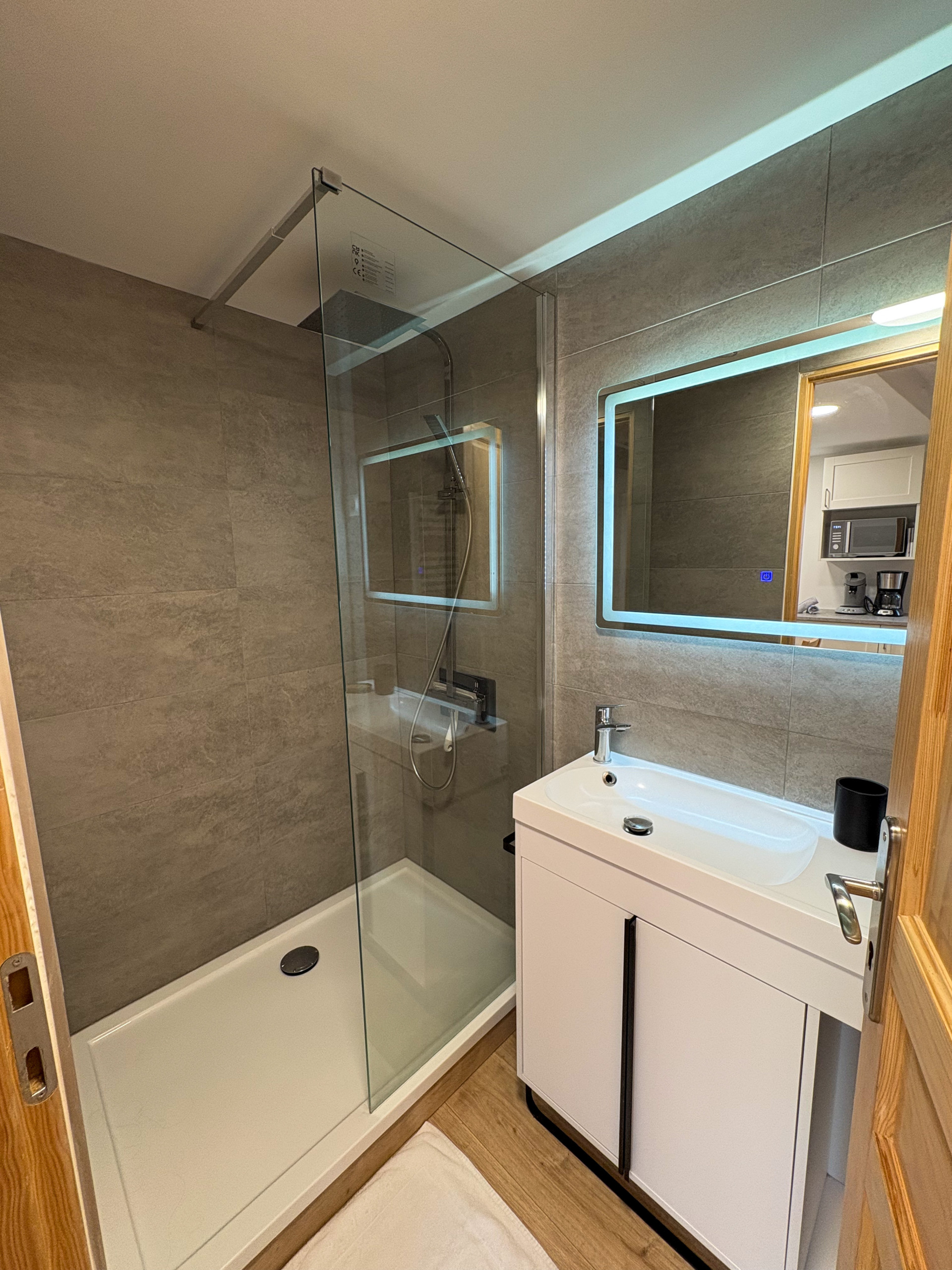 Pour compléter cet espace , un WC séparé et une salle d'eau moderne complète avec douche à l'italienne et meuble vasque rétroéclairé. Un lave-linge est également à votre disposition.