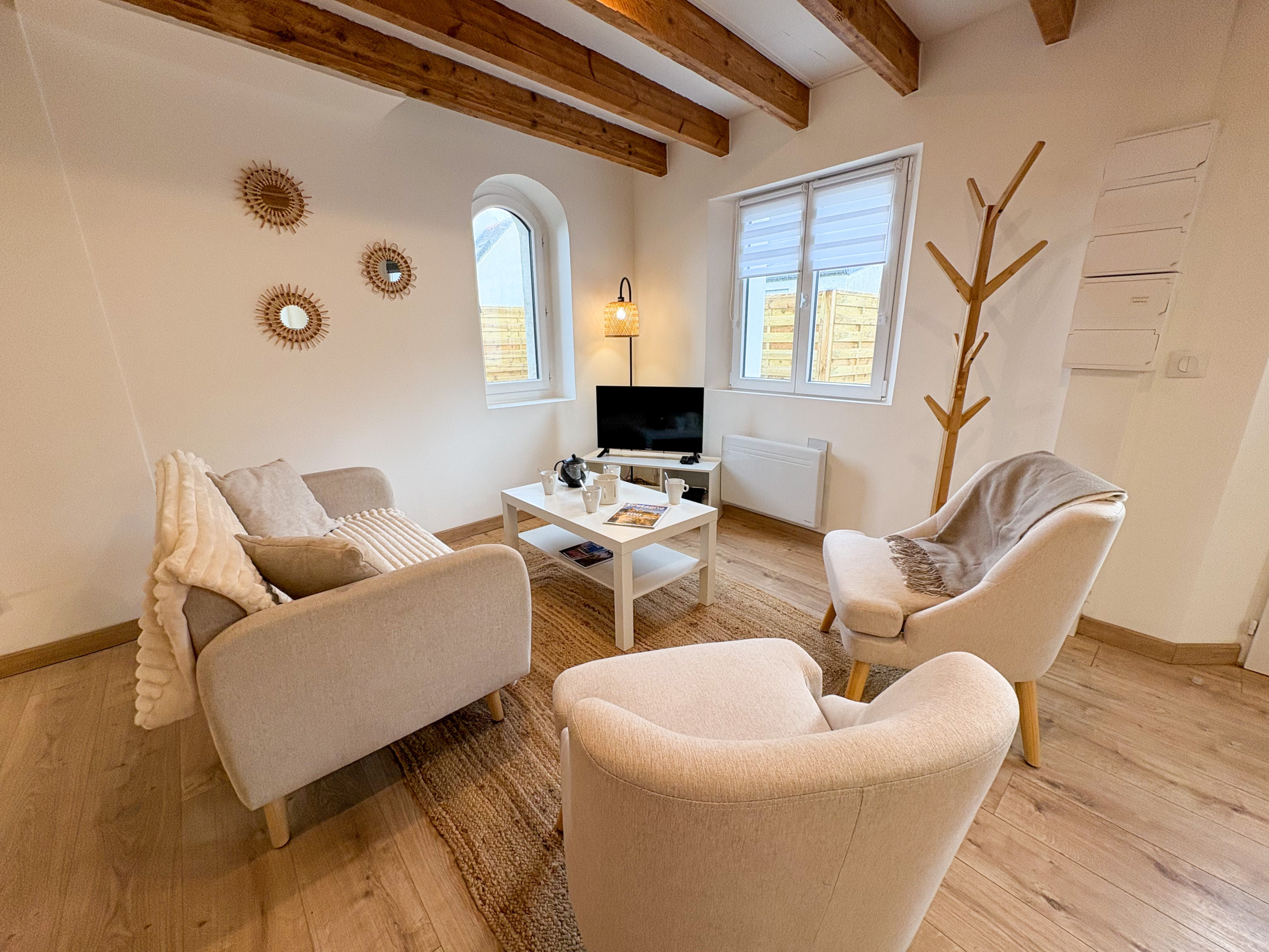 Dès l’entrée, vous serez séduit par la pièce de vie lumineuse, mêlant authenticité et modernité, avec ses poutres apparentes, ses tons doux et son mobilier soigneusement sélectionné.